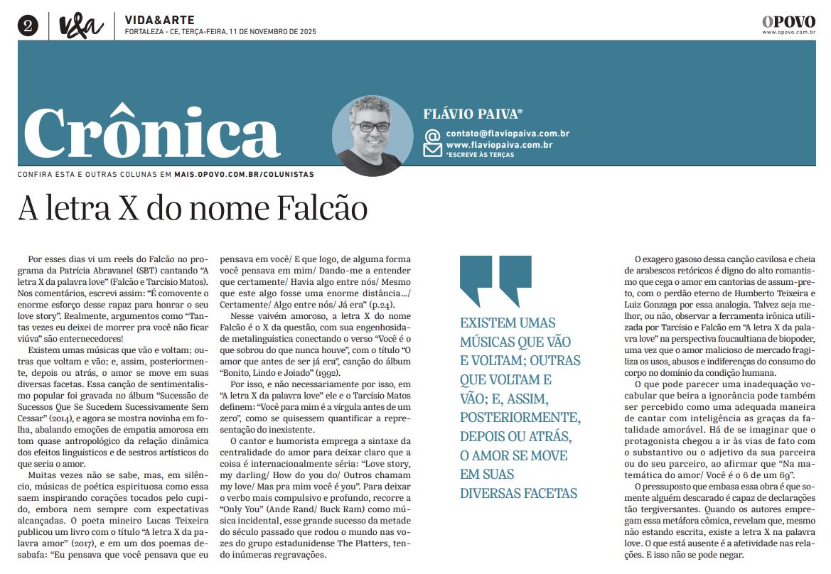 Por esses dias vi um reels do Falcão no programa da Patrícia Abravanel (SBT) cantando “A letra X da palavra love” (Falcão e Tarcísio Matos). Nos comentários, escrevi assim: “É comovente o enorme esforço desse rapaz para honrar o seu love story”. Realmente, argumentos como “Tantas vezes eu deixei de morrer pra você não ficar viúva” são enternecedores!
