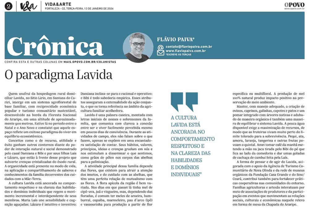 Quem usufrui da hospedagem rural domiciliar Lavida, no Sítio Lírio, em Santana do Cariri, imerge em um sistema agroflorestal de base familiar, com reciprocidade econômica popular e turismo comunitário sustentável, desenvolvido na borda da Floresta Nacional do Araripe, em uma altitude de aproximadamente 900 metros. Estive lá no período entre o Natal e o Ano Novo e constatei que aquele espaço reflete um exitoso paradigma do viver em equilíbrio ecossistêmico.