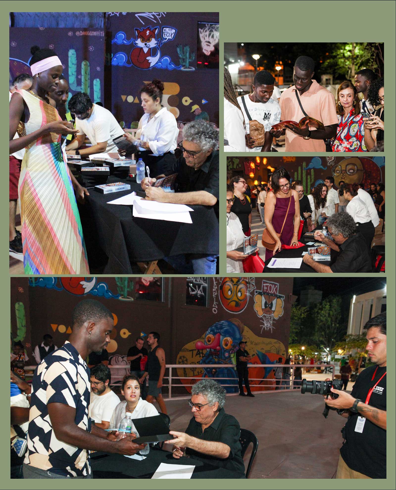 - 4. Simultaneamente ao show, autógrafos tranquilos para evitar filas longas e sobrar tempo para conversas ao final do evento: Olga Ribeiro, Diana, José Armstrong, professora Maria Montenegro, da Escola Integrada de Desenvolvimento e Inovação Acadêmica da UFC (EIDEIA) e estudantes da Unilab