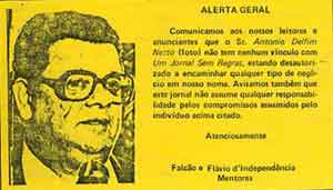 Comunicamos aos nossos leitores e anunciantes que o Sr. Antonio Delfim Netto (foto) não tem nenhum vínculo com Um Jornal Sem Regras, estando desautorizado a encaminhar qualquer tipo de negócio em nosso nome. Avisamos também que este jornal não assume qualquer responsabilidade pelos compromissos assumidos pelo indivíduo acima citado.